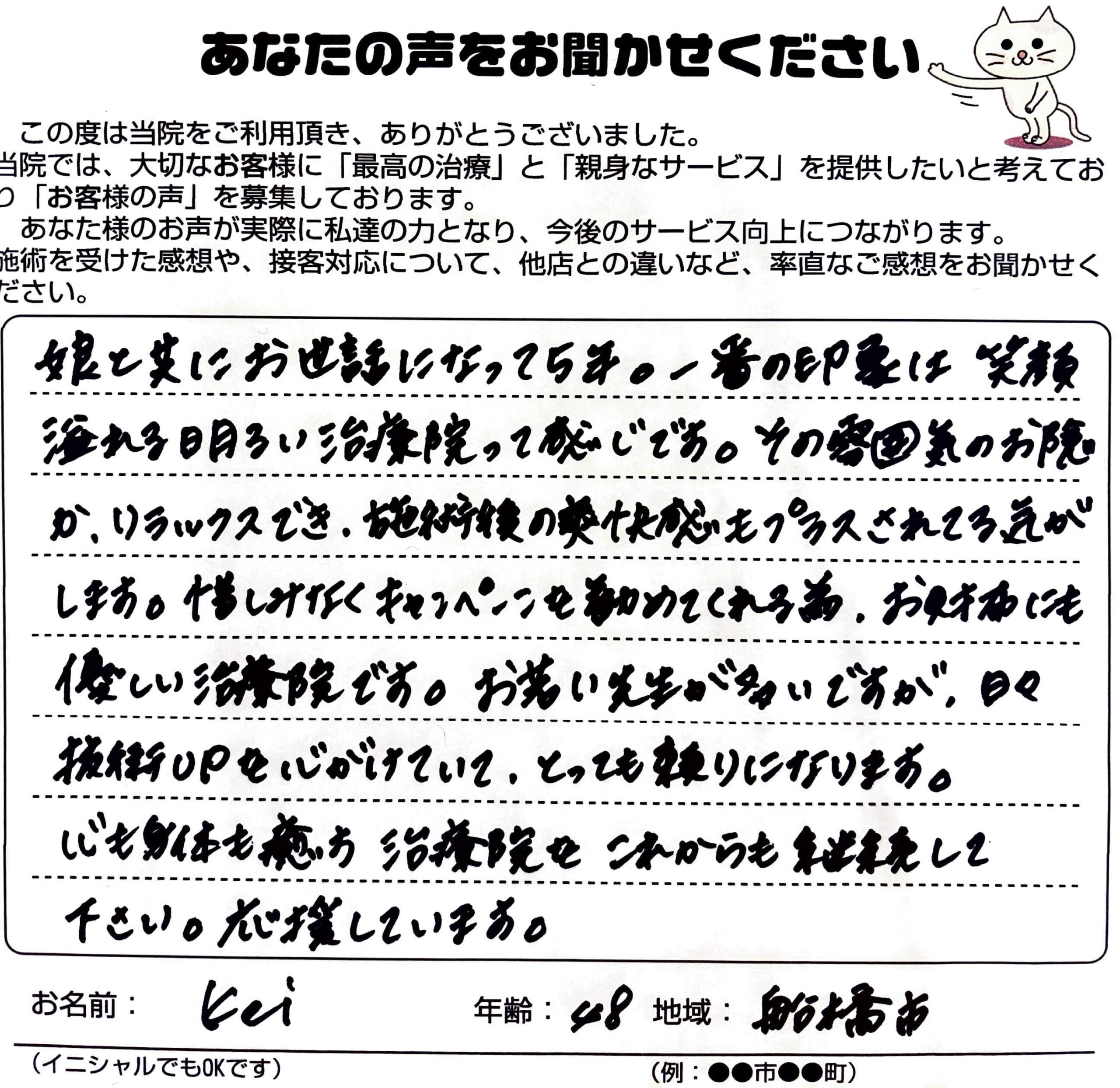 毎日の通勤と仕事の疲れで腰と首.目が辛くなり、通い始めました。はじめは嫁の付き添いで通い始めましたが気づいたら私の方が通っている状況になりました。辛くなっている原因や改善方法までしっかり教えていただけるのでこれからも通い続けたいと思います。皆さん最高の先生です!(K.S)※患者様個人の感想であり、効果には個人差があります。