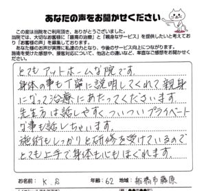 とてもアットフォームな院です。 身体のことも丁寧に説明してくれて親身になって治療にあたってくださいます。 先生方は話しやすく、ついついプライベートなことも話しちゃいます。 施術もしっかりと研修を受けているのでとても上手で身体も心もほぐれます。