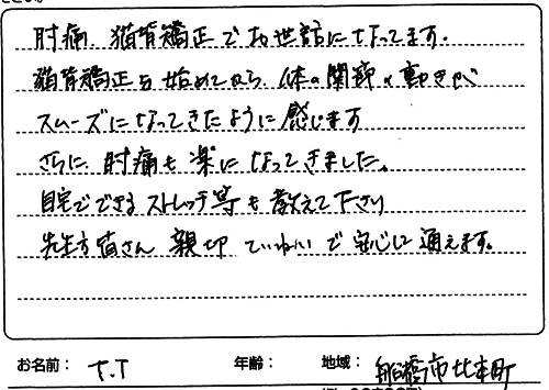 常に話しやすい雰囲気を作ってくださり、腕を上げると少し痛いとか、ちょっとしたことでも応えてくださるので、自分自身以前よりも体について良く気遣うようになったと思います。